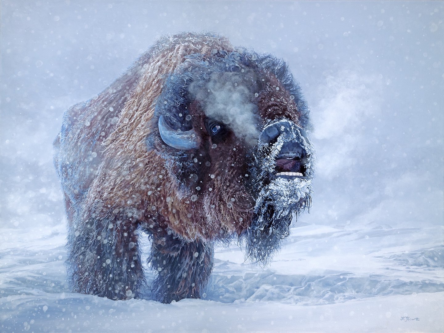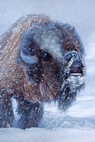 The story behind The Call begins with a long-held vision, the support of a lifelong mentor and friend, and a bison named, Trouble. I had long wanted to paint a bison, and through a gracious rancher, I was introduced to Trouble—born during a fierce snowstorm, injured at birth, and named for the extraordinary effort it took to save his life.